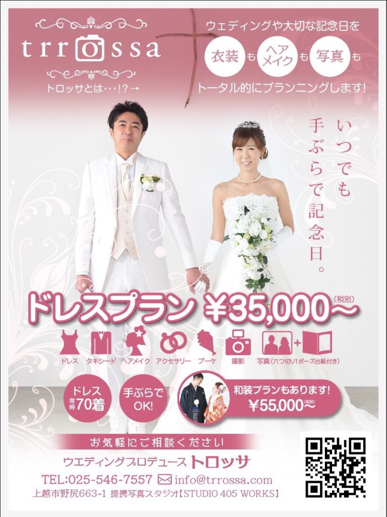 トロッサでは、ブライダルの衣装レンタル、提携写真スタジオでのウェディングフォトプラン、ブライダル出張ヘアメイクをしております(^O^☆♪